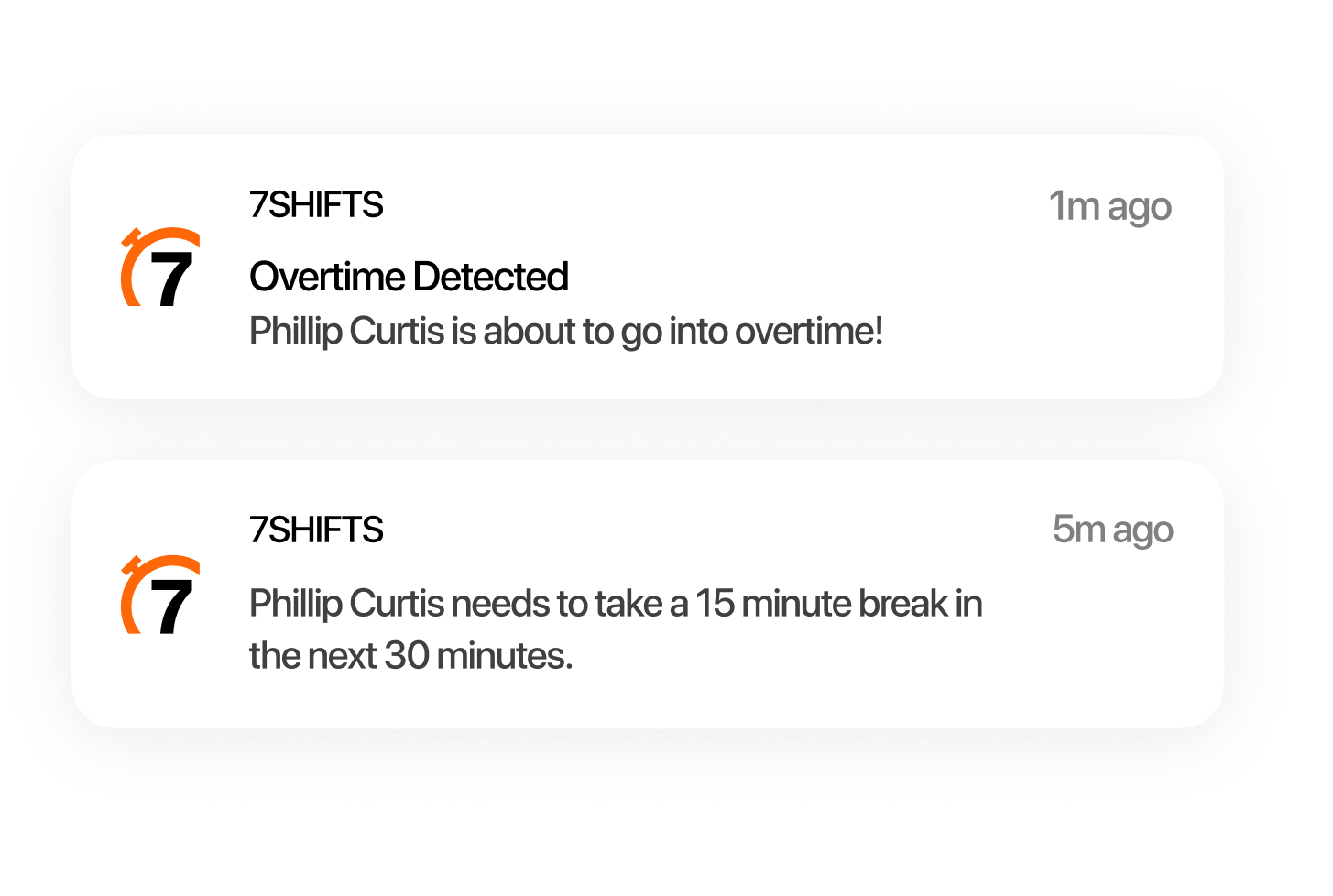With 7shifts Scheduling managers receive OT and break warnings in advance, eliminating surprise labor costs and compliance fees.
